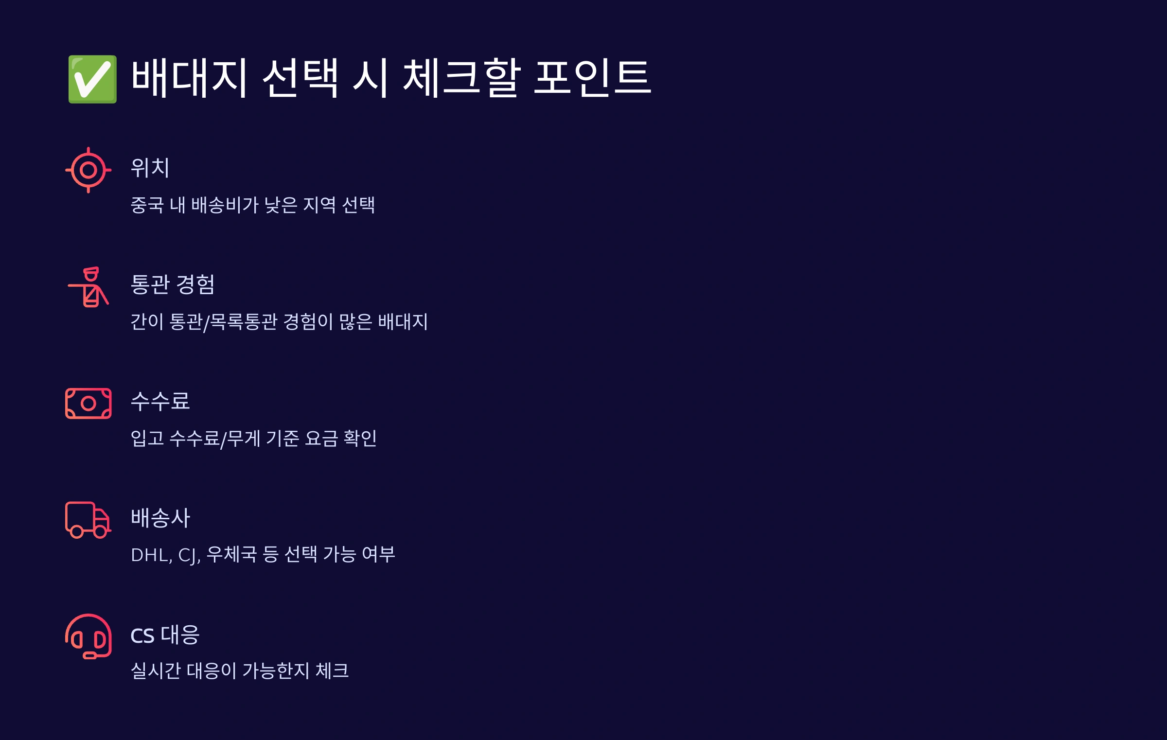 | 🧭 위치 | 광저우, 웨이하이 등 물류센터 위치가 다양한데, 중국 내 배송비가 낮은 지역을 선택 |